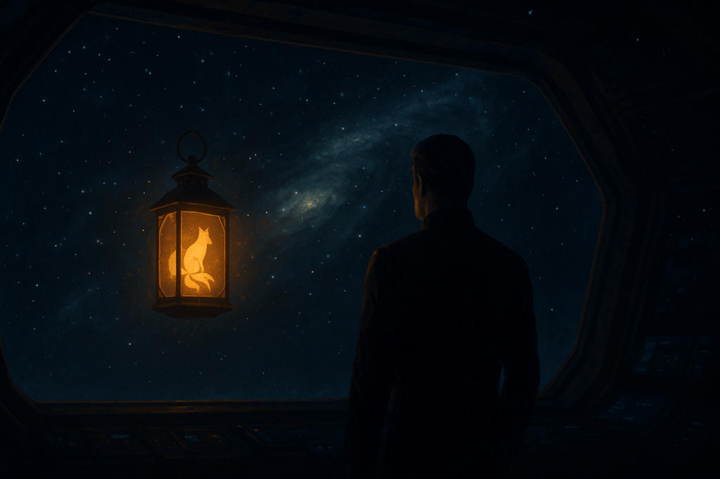 Not a proper piece of ship tech, not in any database Kael knew. It looked like something pulled from an old story—a small iron-framed lantern with frosted panes, burning with a steady, warm golden flame inside. No visible power source. No thrusters. Just hanging there in the vacuum, where it absolutely shouldn’t be.