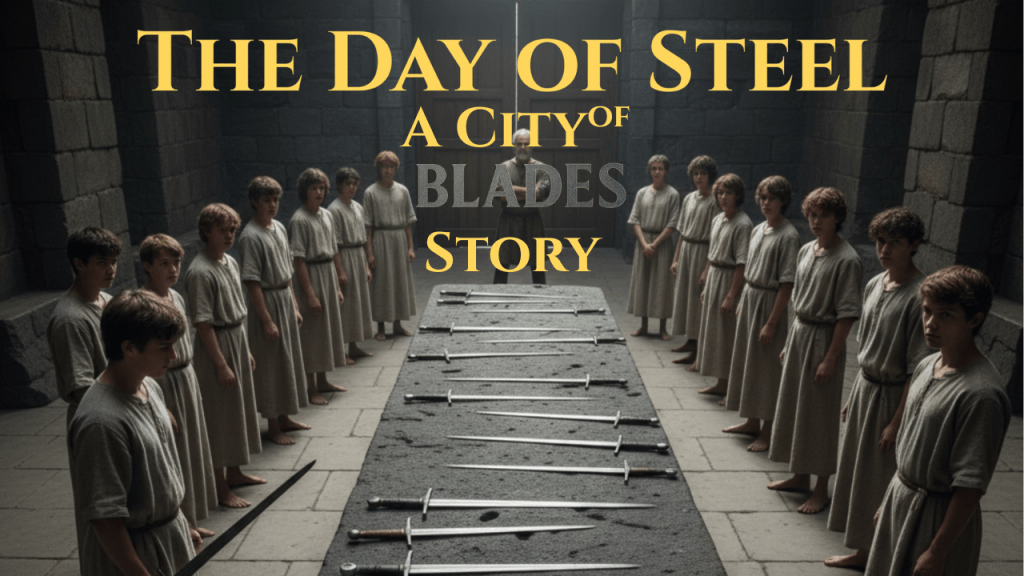 Sound rushed back in—voices, metal, the endless motion of the City of Blades. The candidates paused briefly on the steps, blinking against the daylight, blades unfamiliar at their sides.
